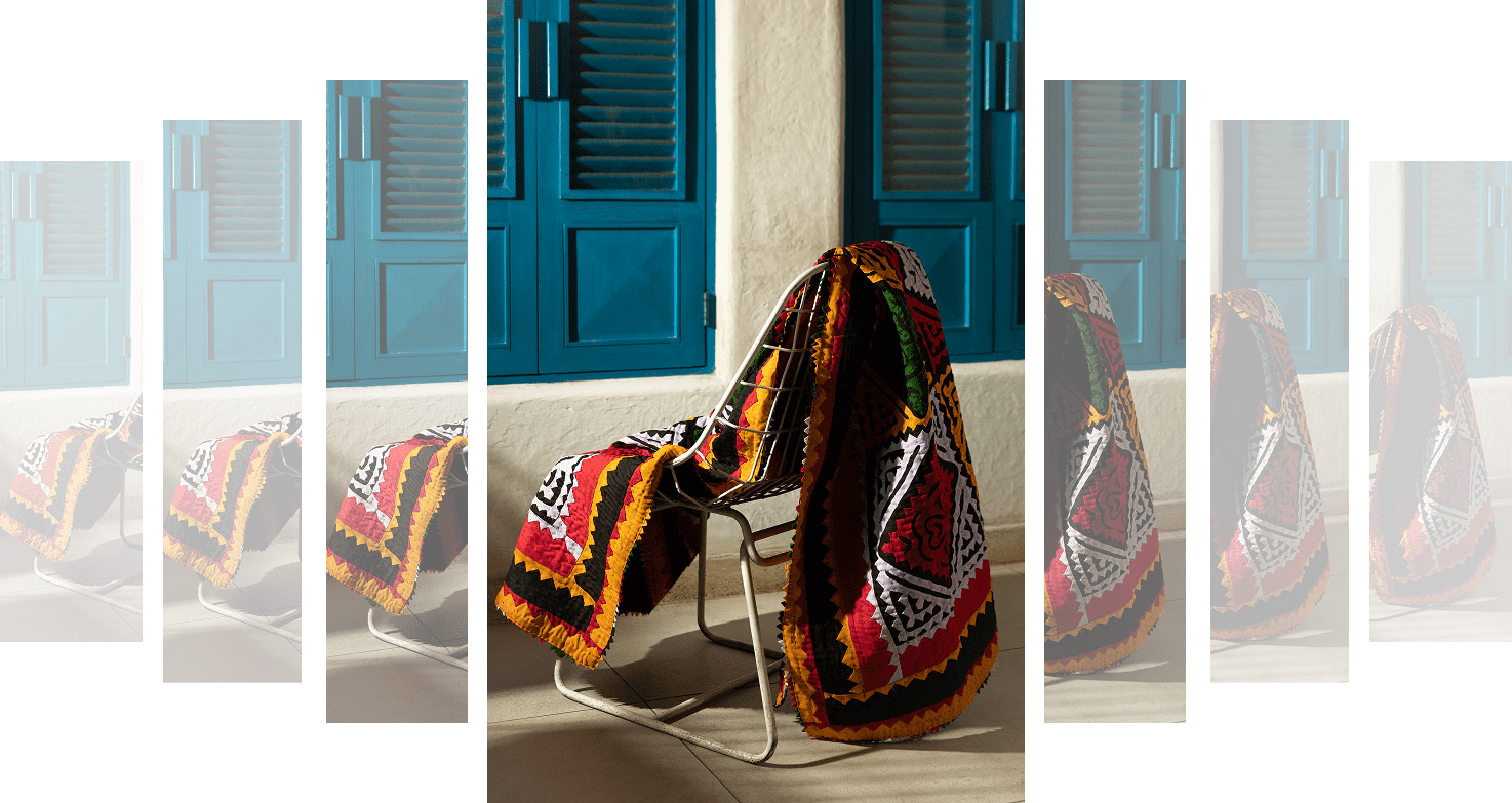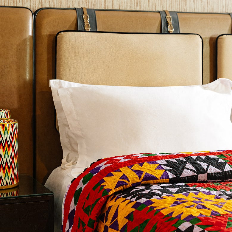 Bright heritage patterns meet modern interiors. Whether layered at the foot of a bed or draped as a statement throw, our Ralli quilts bring warmth and character into every space — a touch of heritage that feels at home anywhere.